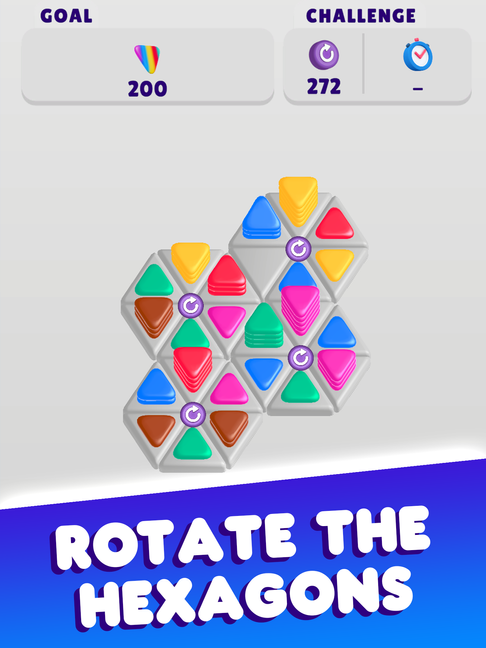 A 3D puzzle game where players build stacks of same-colored pieces by rotating hexagonal tiles. Each level features multiple hexagons divided into six segments, each containing a piece of a different color. By rotating the hexagons, players align matching colors to form stacks, earning points for each completed stack. Some levels challenge players with move limits, while others impose time constraints, and specific levels require stacks of particular colors, adding variety and complexity to the gameplay.